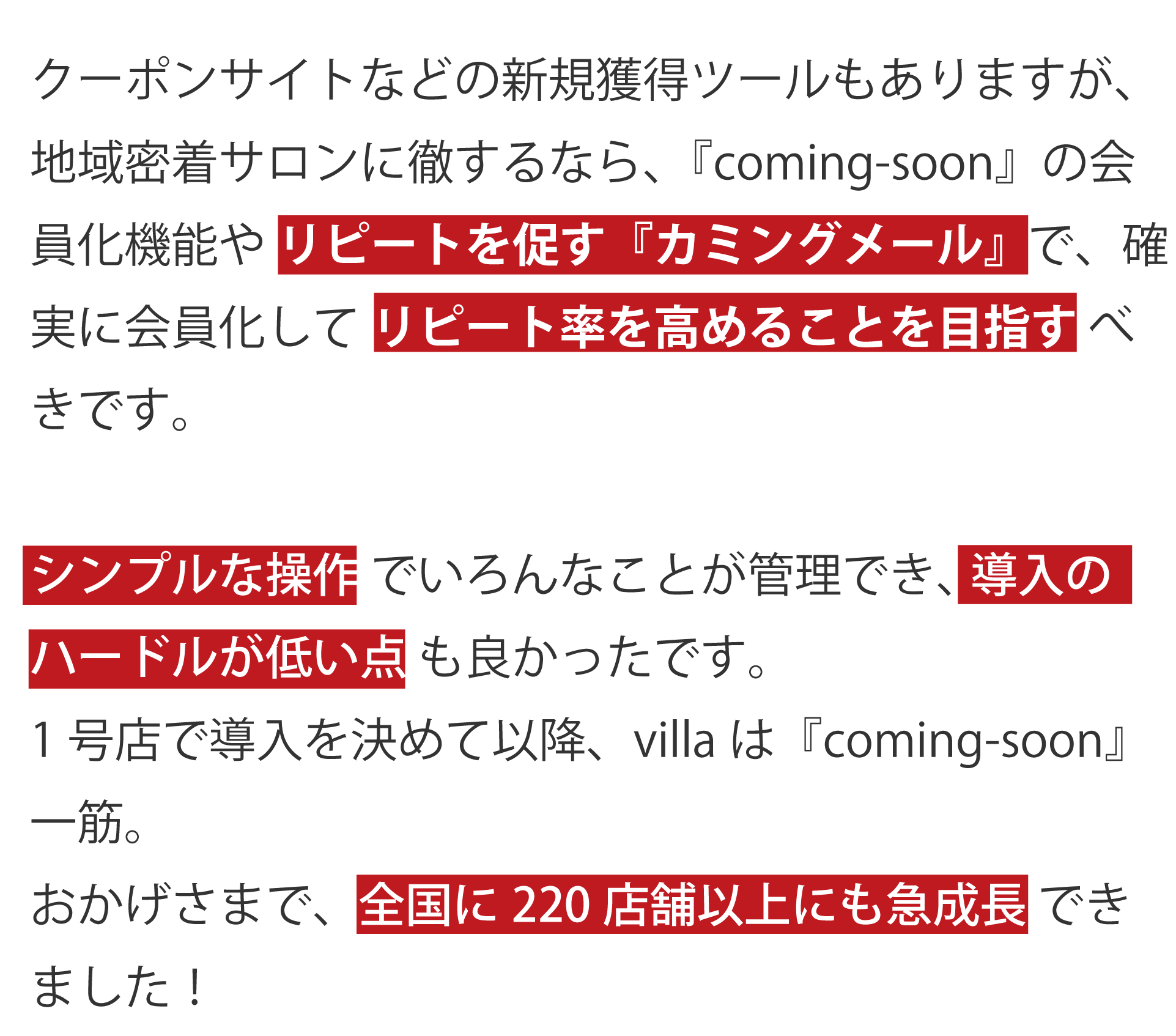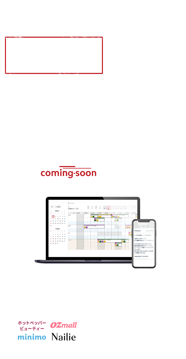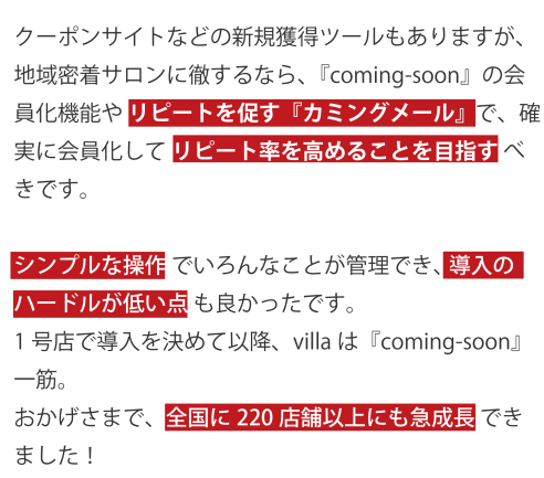 クーポンサイトなどの新規獲得ツールもありますが、地域密着サロンに徹するなら、『coming-soon』の会員化機能やリピートを促す『カミングメール』で、確実に会員化してリピート率を高めることを目指すべきです。