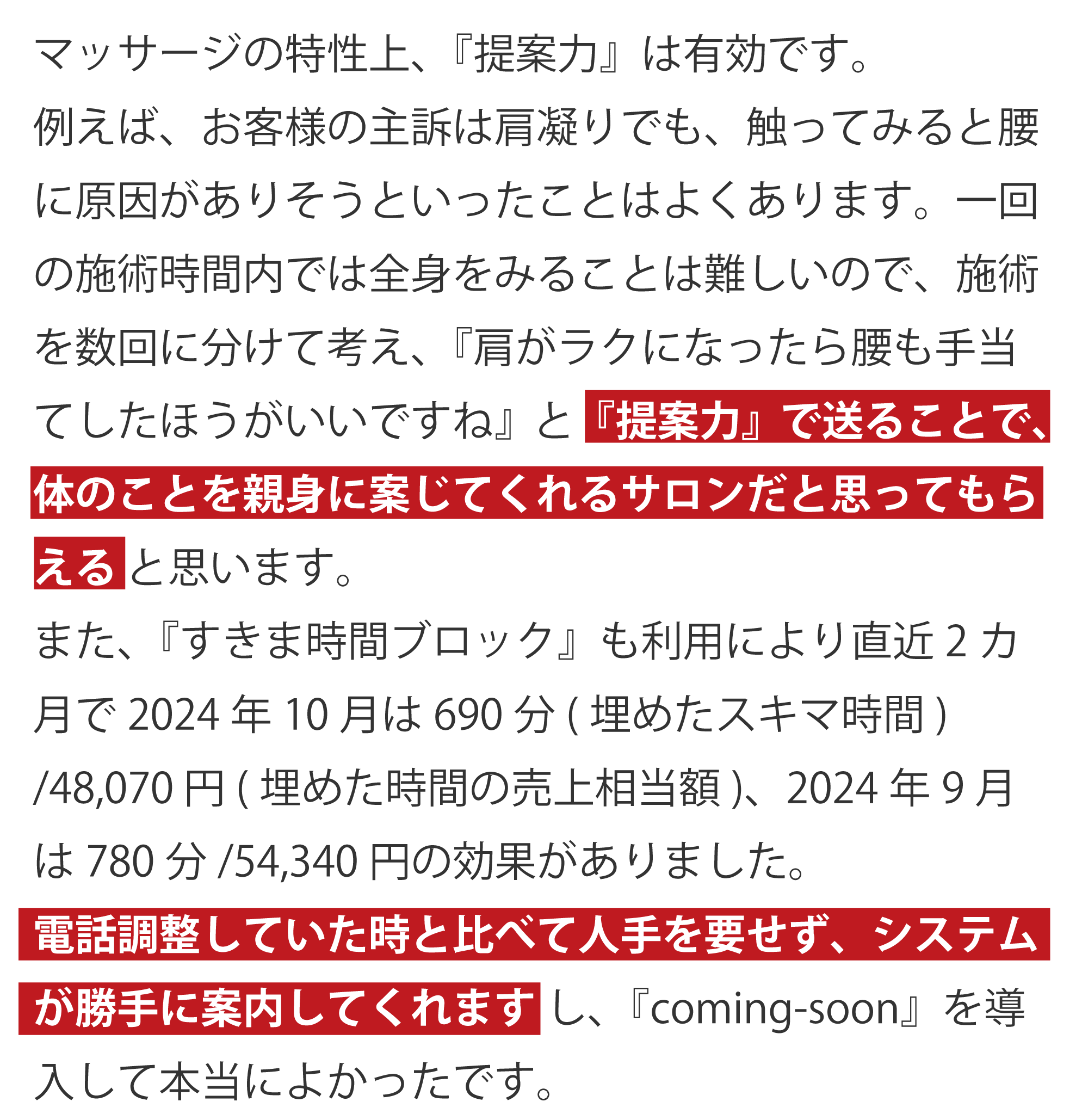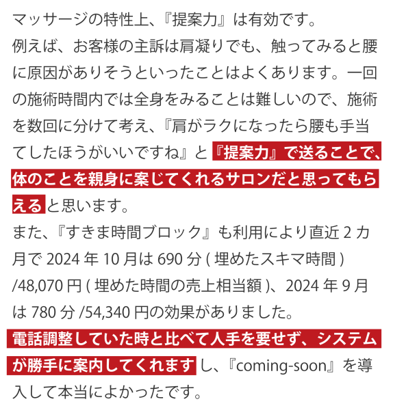 マッサージの特性上、『提案力』は有効です。