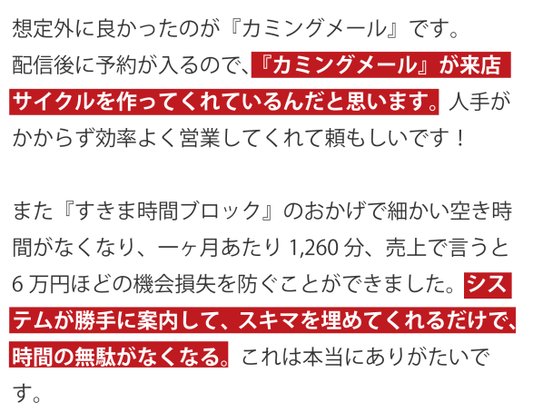 配信後に予約が入るので、『カミングメール』が来店サイクルを作ってくれているんだと思います。人手がかからず効率よく営業してくれて頼もしいです!