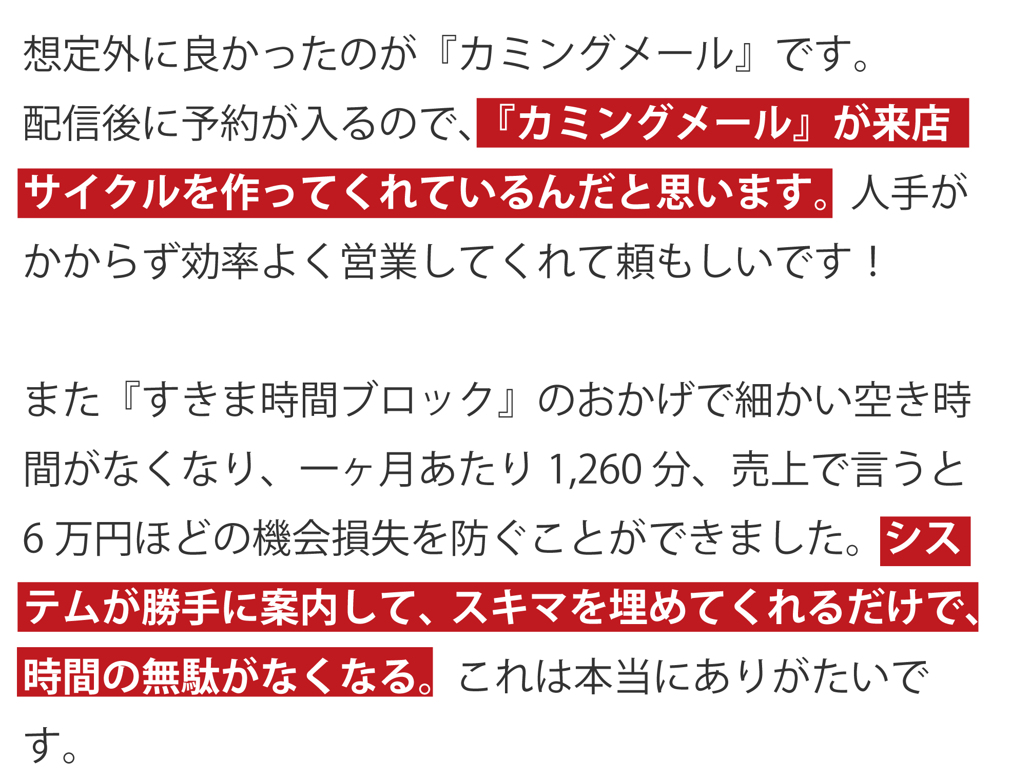 また『すきま時間ブロック』のおかげで細かい空き時間がなくなり、一ヶ月あたり1,260 分、売上で言うと6万円ほどの機会損失を防ぐことができました。システムが勝手に案内して、スキマを埋めてくれるだけで、時間の無駄がなくなる。これは本当にありがたいです。